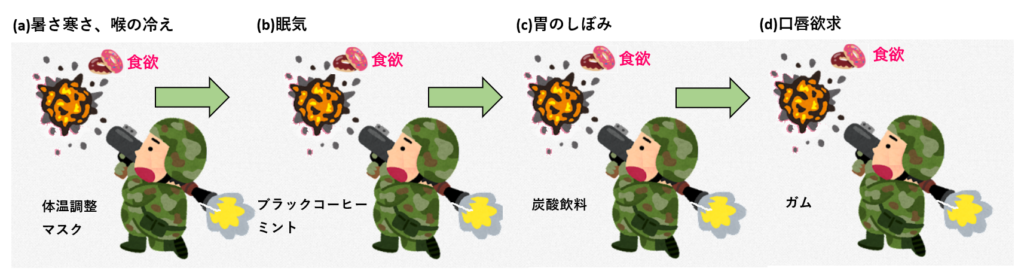 (a)暑さ寒さ、喉の冷え … 暑さ寒さについては、服装調整やエアコン利用により、体温調整して解消します。また、喉の冷えについては、マスクを着用します。こちらにより鼻や口を通る空気の温度、湿度を上げ、結果として余計な食欲を抑制します。